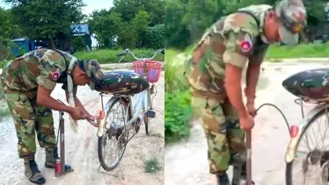 ทหารเขมรเติมลมยางจักรยาน ก่อนเดินทางไปที่ฐานในแนวหน้า ระยะทางห่างจากบ้าน 25 กิโลเมตร ชาวเน็ตไปสงสารได้ขี่แค่จักรยาน