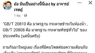 ล่าสุด ทางอาจารย์เจษฎาก็ได้โพสต์แจง เรื่องนี้แล้วโดยมีเนื้อหาดังนี้ว่า... "GB/T 20810 คือ มาตรฐาน กระดาษชำระในห้องน้ำ , GB/T 20808 คือ มาตรฐาน กระดาษทิชชู่ทั่วไป" ของประเทศจีน (แค่นั้นครับ) ถามกันมาใหญ่เลย เรื่องที่มีคนโพสต์ขอความเตือนภัยเกี่ยวกับ "กระดาษทิชชู่" ว่ากระดาษทิชชู ที่มันราคาถูกและขายดี คือกระดาษทิชชูที่เค้าใช้แล้ว และนำกลับมารีไซเคิลและฟอกขาว ไม่เหมาะจะนำมาเช็ดปากเช็ดมือหรือนำมาสัมผัส.. ดูเพิ่ม