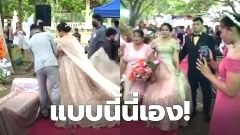 เจ้าสาวซ่อนชายนักวางแผนงานแต่งงานไว้ใต้ชุดแต่งงานเพื่อไม่ให้ 'ลมพัด' กระโปรงเจ้าสาว