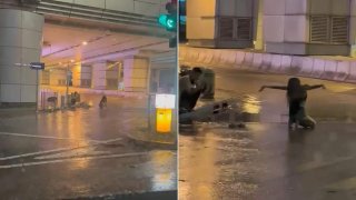 สาวนั่งคุกเข่ากลางถนนตอนพายุเข้า