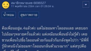สาวมีปัญหาเนื่องจากเพื่อนกลิ่นตัวแรงแต่ไม่กล้าจะบอกไม่รู้จะบอกยังไงดี เพราะเพื่อนก็รันไม่ยอมซื้อโรลออนมาทา เขาจึงได้มาโพสต์ตั้งคำถาม โดยมีเนื้อหาว่าดังนี้ เพื่อนสนิทกลิ่นตัวแรงมาก จะบอกยังไงดีคะ;-; คือเพื่อนอยู่ม.4แล้วค่ะ แต่ไม่ยอมทาโลออนเลย เคยบอกไปอ้อมๆหลายครั้งแล้วค่ะ แต่เหมือนเพื่อนยังไม่รู้ตัว เคยชวนเพื่อนไปซื้อโลออนด้วยกันแล้วก็แกล้งพูดไปว่า “มีพี่ที่รู้จักคนนึงไม่ยอมทาโลออนกลิ่นตัวแรง.. ดูเพิ่ม