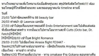 ทางโรงพยาบาลเพิ่งโทรมาแจ้งเมื่อสักครู่นะคะ สรุปกัสจังติดโควิทค่ะ!!!! ต้องขอโทษผู้ที่ใกล้ชิดด้วยนะคะ และขออนุญาตแจ้ง timeline ตามนี้ วันที่ 25/03 ไปทำซิคแพคที่ร้าน 88 beauty bar 26/03 ทำสปา @ Lasenza เอกมัย 27/03 เข้าไปคุยเรื่องบทภาพยนต์ที่ Endo Entertainment และไปเดินเล่นต่อที่เซ็นทรัลลาดพร้าว จากนั้นแวะไปทานโอมากาเสะที่ Cutts (Octo bar, Dr. Fetch) 28/03 เข้าโบส Bright Romance 29/03-31/03 ไปเชียง.. ดูเพิ่ม
