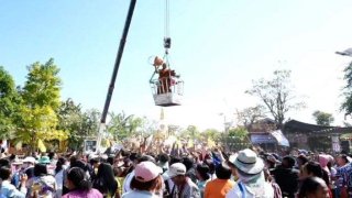 เจ้าอาวาสขึ้นกระเช้า "โปรยทาน 2 แสน" งานบุญทอดกฐิน