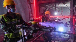 พนักงานกำลังทำงานใน อุโมงค์สำหรับรถไฟความเร็วสูง "กุ้ยหยาง - หนานหนิง" ในเขตปกครองตนเองกว่างซีจ้วง ทางตอนใต้ของจีน เมื่อวันที่ 2 ส.ค. 2021 อุโมงค์นี้มีความยาวถึง 6.61 กม. ซึ่งเป็นโครงการที่สำคัญ ของเมืองทั้ง 2 เมือง (กุ้ยหยาง - หนานหนิง) ซึ่งคาดว่าจะเริ่มเปิดใช้บริการ ภายในสิ้นปี 2023 ดูเพิ่ม