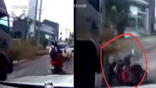 นาทีชีวิต! พ่อลูกขี่จยย.ลื่นเศษพลาสติกล้ม หวิดถูกรถหกล้อเหยียบซ้ำ