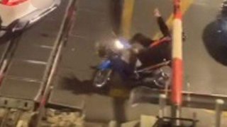 หวิดตาย! จยย.ฝืนฝ่าข้ามทางรถไฟ หัวฟาดไม้กั้นคว่ำ