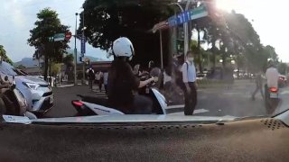 มอไซด์ไม่ยอมเบรคให้คนข้ามถนน เจอคนจริงผลักมอไซด์ล้ม