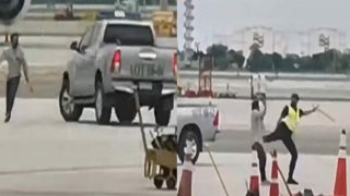 ไล่จับระทึก!หนุ่มคลั่งบิดรถจักรยานยนต์บุกถึงลานจอด"สนามบินสุวรรณภูมิ" หนีขึ้นไปทุบกระจกประตูขึ้นเครื่องบินแตกกระจาย ก่อนโดนรวบ!