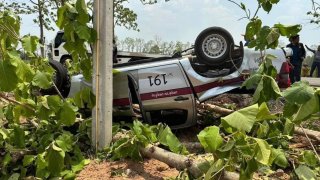 คลั่งยา : ชิงหักพวงมาลัย รถพลิกคว้ำล้อชี้ฟ้า ตำรวจตาย 1 เจ็บ 3 ราย ขณะกำลังคุมตัวชายคลั่งขึ้นรถไปโรงพัก