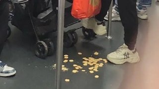 เด็กกินขนมบนรถไฟฟ้า ทำขนมหกเกลื่อน ผู้เป็นแม่ไม่เก็บพร้อมลงรถเลย