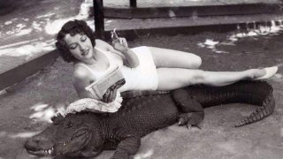 1. จระเข้ผิวคล้ำตัวหนึ่งนอนอยู่บนพื้น ส่วนผู้หญิงอเมริกันคนหนึ่งนอนตะแคงข้างอ่านนิตยสารอย่างสบายๆ 2. ชายร่างกำยำคนหนึ่งยืนด้วยเท้าเปล่าบนพื้นและยกจระเข้ที่ดูไม่ตัวเล็กด้วยมือเดียว 3. เด็กหญิงตัวเล็ก ๆ ที่ดูเหมือนจะอายุเพียงสามหรือสี่ขวบกำลังเดินลงบันไดภกับจระเข้ตัวน้อย 4. หญิงอเมริกันคนหนึ่งกำลังขี่จระเข้ โดยถือ 'บังเหียน' ผูกไว้ที่คอหนาของจระเข้ 5. จระเข้ไม่เพียง แต่สำหรับการขี่ แต่ยังรวมถึงการลา.. ดูเพิ่ม