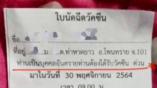 แค่ไม่ได้ฉีดวัคซีน ต้องขนาดนี้เลยหรอ !!! ‘ใบนัดฉีดวัคซีน’ เอากันขนาดนี้เลยเหรอครับ … เรื่องราวนี้เกิดขึ้นในจังหวัด ร้อยเอ็ด ใบนัดวัคซีนสุดปัง ข้อความระบุว่า “ท่านเป็นบุคคลอันตรายท่านต้องได้รับวัคซีน ด่วน … ไม่มาถือว่าท่านไม่ให้ความร่วมมือกับรัฐ” Cr: เพจ หมอแล็บแพนด้า โพสต์ภาพและข้อความ ระบุ “ข้อความในใบนัดฉีดวัคซีน โหดมาก ควรปรับลงนิดนึงนะครับ” ดูเพิ่ม
