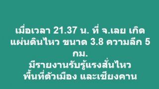เมื่อเวลา 21.37 น. ที่ จ.เลย ได้เกิดแผ่นดินไหว ขนาด 3.8 ริกเตอร์ ความลึก 5 กิโลเมตรมีรายงานรับรู้แรงสั่นไหว พื้นที่ตัวเมือง และเชียงคาน ดูเพิ่ม