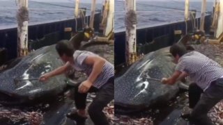 ชาวประมงทุบฉลามวาฬด้วยค้อนก่อนโยนลงทะเล