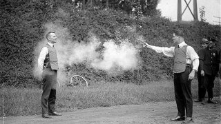 ภาพที่น่าตกใจเมื่อ 100 ปีที่แล้ว: การทดสอบคุณภาพของชุดเกราะโดยให้เพื่อนยิงตัวเอง!
