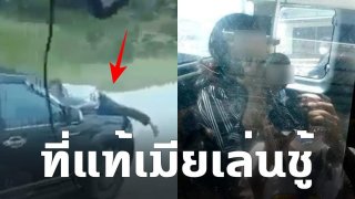 ชายกระโดดเกาะหน้ารถ ที่แท้ ผัวจับได้ว่าเมียเล่นชู้กับเพื่อนรัก แล้วเมียขับรถกระบะหนี