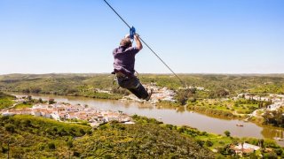 เมื่อมองแวบแรกคุณแทบจะไม่สังเกตเห็นว่ามีสายเหล็กเชื่อมต่อ Sanlucar de Guadiana ใน Andalucia ประเทศสเปนกับ Alcoutim ใน Algarve ประเทศโปรตุเกส ความยาวกว่า 720 เมตรซิปไลน์แห่งเดียวของโลกที่ข้ามพรมแดนระหว่างประเทศพานักท่องเที่ยวข้ามแม่น้ำ Guadiana ด้วยความเร็วระหว่าง 70 ถึง 80 กิโลเมตรต่อชั่วโมง ชานชาลาขาออกตั้งอยู่ที่ด้านข้างของปราสาทSanlúcar de Guadiana ซึ่งอยู่เหนือแม่น้ำเกือบ 100 เมตร จุดลงจอดมีคว.. ดูเพิ่ม