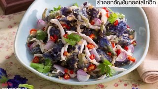 ดอกอัญชัน พืชที่มีต้นกำเนิดอยู่ในแถบอเมริกาใต้ เหมาะสำหรับการปลูกในเขตร้อน อัญชันเป็นไม้ล้มลุก ดอกมีสีน้ำเงินเข้มไปจนถึงสีม่วงและมีสีขาวด้วยเช่นกัน โดยออกดอกเป็นดอกเดี่ยว ในส่วนของดอกชั้นในจะแบ่งออกเป็น 5 กลีบ มีกลีบนอกเป็นสีเขียว ลักษณะของต้นจะเป็นไม้เถาเลื้อยเล็กๆ ใบเป็นใบประกอบ ออกผลเป็นฝัก ลักษณะของผลจะแบนเหมือนฝักถั่ว ดอกอัญชันมีชื่อเรียกที่แตกต่างกันไปแต่ละท้องถิ่น โดยในภาคเหนือนิยมเรียกดอกอ.. ดูเพิ่ม