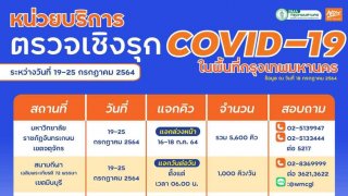 เพจเฟซบุ๊ก "กรุงเทพมหานคร โดยสำนักงานประชาสัมพันธ์" ได้ประกาศแจ้งหน่วยบริการ ตรวจเชิงรุกโควิด19 ในพื้นที่กรุงเทพมหานคร ระหว่างวันที่ 19-25 กรกฎาคม 2564 โดยเปิดบริการทั้งหมด 6 จุด เช่น เขตจตุจักร, เขตมีนบุรี , เขตคลองสาน ,เขตภาษีเจริญ ,เขตห้วยขวาง และ เขตพระโขนง โดยมีกำหนดการแจกบัตรคิว ดังนี้...1. เขตจตุจักร - แจกล่วงหน้า 16-18 ก.ค. 64 (รวม 5,600 คิว)2. เขตมีนบุรี - แจกวันต่อวัน ตั้งแต่เวลา 06.00 .. ดูเพิ่ม
