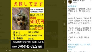 ผู้ใช้ Twitter ชาวญี่ปุ่น ที่ใช้ชื่อว่า @keu_t8 เขาพาสุนัขจำนวน 4 ตัว ไปเดินเล่นที่สวนโยโยกิ กรุงโตเกียว แต่เจ้ากรรม ปลอกคอของสุนัขตัวหนึ่ง กลับหลุดออกจากสายจูง และ สุนัขตัวนั้นก็วิ่งออกไปอย่างรวดเร็ว จนทำเขามองไม่เห็นและหาไม่เจอ... เขาใช้เวลา 1 สัปดาห์ ในการค้นหาหมาของเขา แต่ก็ไม่เป็นผล และ ตอนนี้กำลังขอให้ผู้ใช้ Twitter เข้าร่วมในการค้นหา และ คนที่หาเจอและนำมันมาให้ เขาจะให้เงินรางวัล จำนวน 5 ล.. ดูเพิ่ม