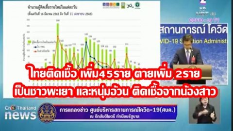 วันนี้ (11 เม.ย.63) ที่ทำเนียบรัฐบาล นายแพทย์ทวีศิลป์ วิษณุโยธิน โฆษกศูนย์บริหารสถานการณ์การแพร่ระบาดของโรคติดเชื้อไวรัสโคโรน่า 2019 (ศบค.) แถลงข่าว สถานการณ์แพร่ระบาดไวรัสโควิด-19 ประจำวันนี้ ว่า ประเทศไทยพบจำนวนผู้ติดเชื้อรายใหม่เพิ่ม 45 ราย รวมยอดสะสม 2,518 ราย ใน 68 จังหวัด เสียชีวิตเพิ่ม 2 ราย รวมผู้เสียชีวิตสะสม 35 ราย รวมผู้ติดเชื้อที่หายกลับบ้านแล้ว 1,135 รายผู้เสียชีวิต 2 ราย เป็นเพศชาย-.. ดูเพิ่ม
