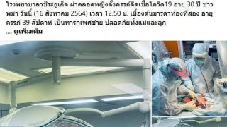 เพจเฟซบุ๊ก ภาควิชาวิสัญญี โรงพยาบาลวชิระภูเก็ต เผยแพร่ภาพและเรื่องราวการผ่าคลอดให้กับหญิงชาวเมียนมา อายุ 30 ปี ซึ่งตั้งอายุครรภ์ 39 สัปดาห์ และติดเชื้อโควิด-19 โดยทางโรงพยาบาลได้วางแแผนการดูแลรักษาและเตรียมการผ่าตัดคลอด ตั้งแต่กระบวนการดูแลผู้ป่วย การรับผู้ป่วย เพื่อป้องกันการแพร่กระจายของเชื้อระหว่างการเคลื่อนย้ายผู้ป่วยจนถึงห้องผ่าตัดเพื่อให้มีประสิทธิภาพและมีความปลอดภัยอย่างสูงสุด การผ่าตัดครั.. ดูเพิ่ม