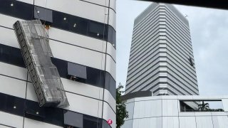 ทหารช่วยเหลือคนงานเช็ดกระจก จากกระเช้าลอยฟ้า ที่ห้อยอยู่ด้านนอกอาคารสูง