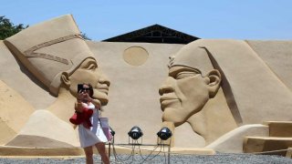 นักท่องเที่ยวถ่ายเซลฟี่ หน้ารูปปั้นทรายที่ "เมืองแห่งทราย" ในเมืองฮูร์กาดา จังหวัดทะเลแดง ประเทศอียิปต์ มีประติมากรรมทรายให้เห็น เยอะแยะมากมาย นักท่องเที่ยวถ่ายรูปประติมากรรมทราย ดูเพิ่ม