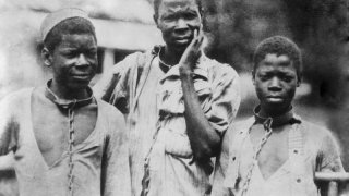'พระราชบัญญัติการเลิกทาส' ของปี 1833 ยุติการเป็นทาสในจักรวรรดิอังกฤษ กองทัพเรือเริ่มปฏิบัติการต่อต้านการเป็นทาสโดยมุ่งเป้าไปที่เรือโปรตุเกสและสเปนเป็นหลัก ภาพนี้แสดงให้เห็นกะลาสีเรือกำลังตัดกุญแจเท้าออกจากทาสที่เพิ่งได้รับอิสรภาพ ชาวแอฟริกันในภาพถ่ายนี้คือ 'ทาสหกคน' ที่ได้รับการช่วยเหลือจากเรือในระหว่างการล่องเรือบนชายฝั่งบาติเนห์ของโอมาน ตั้งแต่วันที่ 10 ถึง 14 ตุลาคม ต่อมากองทัพเรืออังกฤษที่ควบค.. ดูเพิ่ม