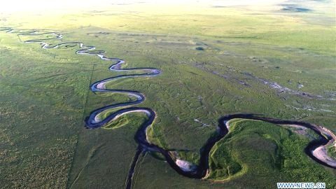 สายน้ำคดเคี้ยวแต่งแต้มทุ่งหญ้าเขียวของมองโกเลีย