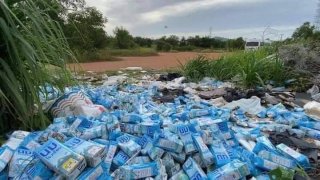 เสียดายแทนพบ 'นมโรงเรียน' เกือบ 1,000 กล่อง !!! ถูกทิ้งป่าหญ้าข้างทาง