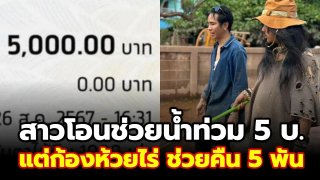 บุญหล่นทับสาวใจบุญ โอนช่วยน้ำท่วม 5 บาท เพราะตนก็ลำบาก ช่วยได้แค่นี้ แต่ก้องห้วยไร่ช่วยคืน 5 พัน!!!