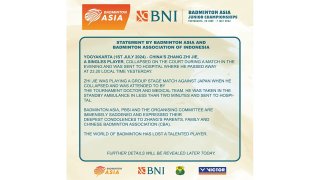 ครอบครัวนักแบดชาวจีนกังขา การให้ความช่วยเหลือของเจ้าหน้าที่สนามกีฬาล่าช้าทำให้ช่วยชีวิตนักแบดอนาคตไกลได้ไม่ทัน 'จาง จื้อเจี๋ย' Zhang Zhijie(张志杰) นักแบดมินตันชาวจีน วัย 17 ปี เสียชีวิตเมื่อวันอาทิตย์ระหว่างการแข่งขันแบดมินตันเอเชีย จูเนียร์ แบดมินตัน แชมเปี้ยนชิพส์ 2024 ที่เมืองยอกยาการ์ตา ประเทศอินโดนีเซีย ตามแถลงการณ์ร่วมของแบดมินตันเอเชียและสมาคมแบดมินตันแห่งอินโดนีเซีย ถือเป็นเรื่องน่าเศร้าเป็น.. ดูเพิ่ม