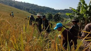 นายอำเภอเชียงกลาง นำสมาชิกอาสารักษาดินแดน จิตอาสาพระราชทาน ลงแขกเกี่ยวข้าวช่วยชาวบ้านในพื้นที่สูง