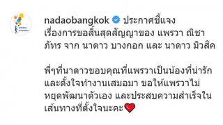 สิ้นสุดสัญญา "แพรวา ณิชาภัทร" โบกมือลา นาดาว อดีตต้นสังกัดเคารพการตัดสินใจ