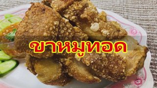 ขาหมูทอด น้ำจิ้มรสเด็ด ส่วนผสม 1.ขาหมู 1 ขา 2. เกลือ 3. ขิง 4. ต้นหอม 5. ใบกระวาน 6. อบเชย 7. โป๊ยกั้ก 8. ลูกกระวาน 9. พริกไทยดำ 10. นำมันพืช ส่วนผสมน้ำจิ้ม 1. พริกชี้ฟ้า 2. กระเทียม 3. รากผักชี 4. น้ำตาลปีบ 5. มะนาว 6. น้ำปลา วิธีทำ 1. ล้างขาหมู ถูด้วยเกลือ แล้วล้างน้ำ 2. ตั้งหม้อเติมน้ำ 3 ลิตร ใส่เกลือ ขิง ต้นหอม ใบกระวาน อบเชย โป๊ยกั้ก ลูกกระวาน พริกไทยดำ น้ำเดือดแล้วใส่ขาหมูลงต้ม 2 ชั่วโมง 3. .. ดูเพิ่ม