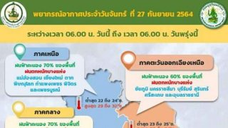 ฃ กรมอุตุเตือน "ฝนถล่ม 36 จังหวัด ตกหนักร้อยละ 70% ของพื้นที่ เสี่ยงน้ำท่วมฉับพลัน และ น้ำป่าหลาก" กรมอุตุนิยมวิทยา ได้พยากรณ์อากาศ 24 ชั่วโมงข้างหน้า คาดว่า "บริเวณภาคเหนือ ภาคตะวันออกเฉียงเหนือตอนล่าง ภาคกลาง ภาคตะวันออก และ ภาคใต้ มีฝนตกหนักเป็นบางพื้นที่ จึงใคร่ขอให้ประชาชนในบริเวณพื้นที่เสี่ยงภัย ระวังอันตรายจากฝนตกหนัก และ ฝนที่ตกสะสม ซึ่งอาจทำให้เกิดน้ำท่วมฉับพลัน และ มีน้ำป่าไหลหลาก..." เน.. ดูเพิ่ม