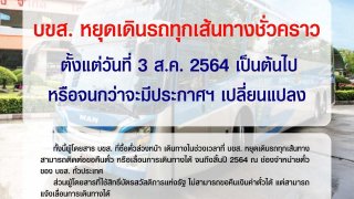 วันที่ 2 สิงหาคม 2021 Facebook ของ บขส. ได้ออกมาประกาศหยุดเดินรถทุกเส้นทางชั่วคราว ตั้งแต่วันที่ 3 สิงหาคม 2564 เป็นต้นไป จนกว่าจะมีประกาศคำสั่งเปลี่ยนแปลง# ดร.สัญลักข์ ปัญวัฒนลิขิต กรรมการผู้จัดการใหญ่ บริษัท ขนส่ง จำกัด (บขส.) เปิดเผยว่า เพื่อให้สอดคล้องกับคำสั่งของศูนย์บริหารสถานการณ์การแพร่ระบาดของโรคติดเชื้อไวรัสโคโรนา 2019 (โควิด-19) ในการขยายเวลาบังคับใช้มาตรการสำหรับพื้นที่ควบคุมสูงสุดและ.. ดูเพิ่ม