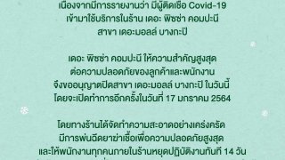 16 ม.ค.64 มีการรายงานว่า มีผู้ติดเชื้อโควิด-19 เข้ามาใช้บริการในร้าน เดอะพิซซ่า คอมปะนี สาขาเดอะมอลล์ บางกะปิ ดังนั้น เดอะ พิซซ่า คอมปะนี จึงได้ประกาศปิดสาขาเดอะมอลล์ บางกะปิ ในวันนี้ โดยจะเปิดทำการอีกครั้งในวันที่ 17 ม.ค. 64 เนื่องจากมีการรายงานว่า มีผู้ติดเชื้อ Covid-19 เข้ามาใช้บริการในร้าน เดอะ พิซซ่า คอมปะนี สาขา Gateway Bangsue เดอะ พิซซ่า คอมปะนี ให้ความสำคัญสูงสุดต่อความปลอดภัยของลูกค้าแล.. ดูเพิ่ม