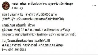 ด่วน ! ประกาศจับ รางวัลนำจับ 50,000 บาท (สำหรับผู้พบเห็นและแจ้งเบาะแสจนถึงนำจับตัวได้) นายณัฐยศ หรือหนึ่ง สีราม ภูมิลำเนา ที่อยู่ 32 ม.2 ต.ลานข่อย อ.ป่าพะยอม จ.พัทลุง ผู้ต้องตาม หมายจับศาลจังหวัดพัทลุง ข้อหา พยายามฆ่าผู้อื่น !!...ผู้ใดพบเห็นหรือแจ้งเบาะแสได้ที่...!!! พ.ต.อ.ยศวรรธน์ กระจ่างวงศ์ ผกก.สส.ภ.จว.พัทลุง โทร. 092-8919561 ภาพดังกล่าว ดูเพิ่ม