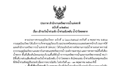 ประกาศเตือน! ระหว่างวันที่ 10-13 พฤษภาคมนี้ ขอให้เฝ้าระวังสถานการณ์น้ำท่วมเฉียบพลันและน้ำป่าไหลหลาก สำนักงานทรัพยากรน้ำแห่งชาติได้ออกประกาศเตือนให้ประชาชนเฝ้าระวังน้ำท่วมเฉียบพลันและน้ำป่าไหลหลากในช่วงวันที่ 10-13 พฤษภาคมนี้ เนื่องจากมีการคาดการณ์พายุฤดูร้อนที่จะส่งผลให้เกิดฝนตกหนักในหลายพื้นที่ของประเทศไทย โดยเฉพาะในเขตชุมชนเมืองและพื้นที่เสี่ยงน้ำท่วมที่มีประวัติการเกิดน้ำท่วมอยู่เป็นประจำ การปร.. ดูเพิ่ม