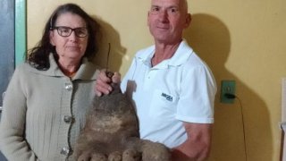 เหมือนจริงๆ มันฝรั่งยักษ์หนัก 8 กิโลกรัม รูปร่างคล้ายเท้าของมนุษย์ Marli และ Paulo Ciquinel เกษตรกรในเมือง Meleiro ในรัฐ Santa Cantarina ตอนใต้ของบราซิล คือเจ้าของมันฝรั่งยักษ์ที่มีรูปร่างสุดประหลาดจนใครๆเห็นแล้วต้องทึ่ง โดยมันฝรั่งดังกล่าวนั้นเกิดจากการกลายพันธุ์จนมีรูปร่างคล้ายๆเท้าของมนุษย์ พร้อมกับนิ้วเท้าที่เหมือนจริงมากๆ ภาพ: CEN ดูเพิ่ม