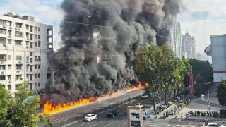 รถบรรทุกน้ำมันรั่วลามมอเตอร์ไซค์ไฟฟ้าเป็นแนวเพลิงยาว ชาวจีนเปรียบ “มังกรไฟคำราม