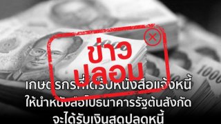 ข่าวปลอม ‼️ เกษตรกรที่ได้รับหนังสือแจ้งหนี้ ให้นำหนังสือไปธนาคารรัฐต้นสังกัด จะได้รับเงินสดปลดหนี้