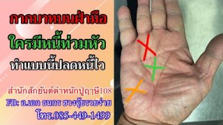 กากบาทบนฝ่ามือ ใครมีหนี้ท่วมหัว ทำแบบนี้ปลดหนี้ไว คนมีเส้นกากบาทบนฝ่ามือ เหมือนคนมีกรรม ที่ต้องมาใช้หนี้แทนคนอื่นเค้า เรื่องหน้าปวดใจอย่างหนึ่งเงินตัวเองหามาด้วยความยากลำบาก ตัวเองจะใช้คิดแล้วคิดอีก แต่พอเป็นเรื่องคนอื่นไม่อยากให้ก็ต้องให้เหมือนโดนบังคับ หามาแทบไม่ได้ใช้ แถมคนที่เราให้เงินหรือเป็นหนี้แทนเค้าดันไม่รู้บุญคุณเราอีกด้วย ดูเพิ่ม