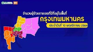 จำนวนผู้ป่วยรายเขตที่มีที่อยู่ในพื้นที่กรุงเทพฯ ประจำวันที่ 10 พฤศจิกายน 2564 รวม 50 เขต มีผู้ติดเชื้อ 595 ราย อยู่ระหว่างติดตามที่อยู่ขณะป่วย 15 ราย 10 อันดับเขตที่มีผู้ติดเชื้อสูงสุด 1. บางพลัด 51 ราย 2. สายไหม 43 ราย 3. บางเขน 32 ราย 4. ดินแดง 27 ราย 5. บางซื่อ 27 ราย 6. คันนายาว 24 ราย 7. คลองสามวา 18 ราย 8. จตุจักร 18 ราย 9. ดอนเมือง 18 ราย 10. ภาษีเจริญ 16 ราย ดูเพิ่ม