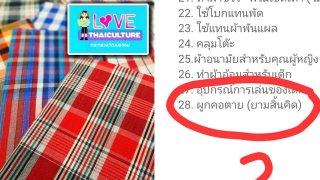 เหมาะสม? กระทรวงวัฒนธรรม ระบุประโยชน์ "ผ้าขาวม้า" ใช้ผูกคอ ยามสิ้นคิด โดยชาวเน็ตท่านหนึ่งได้หาข้อมูลเกี่ยวกับ "ผ้าขาวม้า" แล้วไปกดเจอในเว็บไซต์ของกระทรวงวัฒนธรรมไทย เขียนประโยชน์ผ้าขาวม้าข้อสุดท้าย ว่าสาามารถใช้ "ผูกคอตาย (ยามสิ้นคิด)" ความเห็นชาวเน็ต ดูเพิ่ม