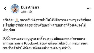 #UPDATE จากเฟซบุ๊ก: Due Arisara ดิว อริสรา ออกมาโพสต์ยืนยันกลับไทยแน่นอน ขอบคุณทุกคนที่เป็นห่วง ครอบครัวทำอาชีพปกติ เงินสะอาด ไม่มีอะไรให้ย้อนกลับมาทำร้าย ขอเป็นกระบอกเสียงที่ไม่อยากปล่อยผ่านเรื่องที่ผิด จากเฟซบุ๊ก: Due Arisara ก่อนทิ้งท้ายว่า ทราบดีว่าสิ่งที่ทำมันค่อนข้างเสี่ยง "เพราะ 4 พี่น้อง มีคนนึงเป็นตำรวจที่ใช้เส้นสายเข้าไป ก็ถือว่าเป็นผู้มีอิทธิพล ตำรวจที่ขับรถสปอร์ตไปทำงาน" จากเฟซบุ๊ก: D.. ดูเพิ่ม