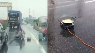 อารมณ์ไม่ดี!! มนุษย์ลุงแบกถังแก๊สต้มบะหมี่กินกินแก้เซ็งกลางถนน ทำรถติดหนึบ
