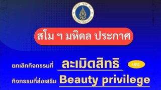ทางเพจ สโมสรนักศึกษามหาวิทยาลัยมหิดล l Mahidol University Student Association โพสต์เรื่องราว สโมสรนักศึกษาม.มหิดลประกาศยกเลิก กิจกรรมดาวเดือน ประชุมเชียร์ รวมถึงกิจกรรมที่ละเมิดสิทธิมนุษยชน และกิจกรรมที่ส่งเสริม Beauty privilege ทุกรูปแบบ ‼️สโมสรนักศึกษามหาวิทยาลัยมหิดลประกาศยกเลิกกิจกรรมประชุมเชียร์รวมถึงกิจกรรมที่ละเมิดสิทธิมนุษยชนและยกเลิกกิจกรรม Mu ambassador (กิจกรรมดาวเดือน) รวมถึงกิจกรรมที.. ดูเพิ่ม